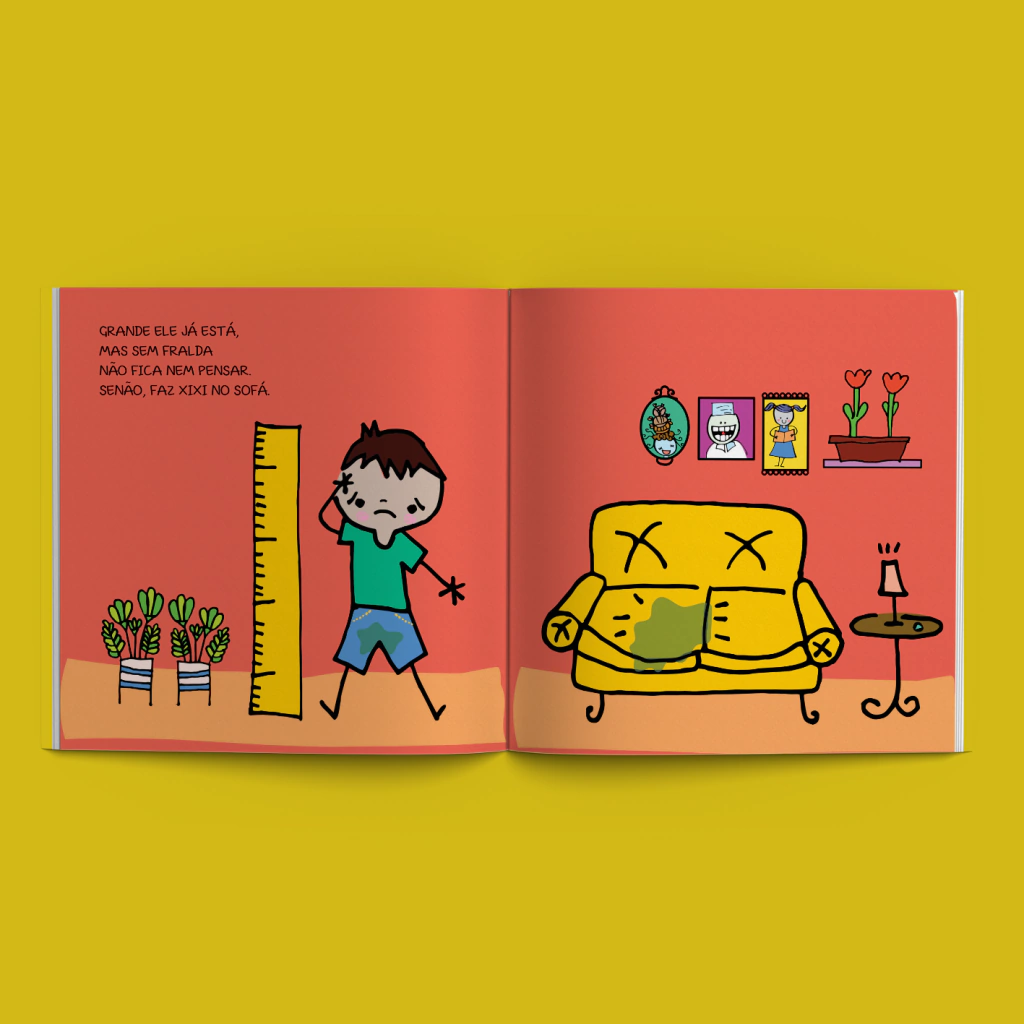 Com rimas e ilustrações divertidas, Tem alguém com (sem) fralda mostra cenas comuns de uma família que está tentando o desfralde: aquela correria para o banheiro para o xixi não pingar no chão e a expectativa de chegar ao desfralde noturno.